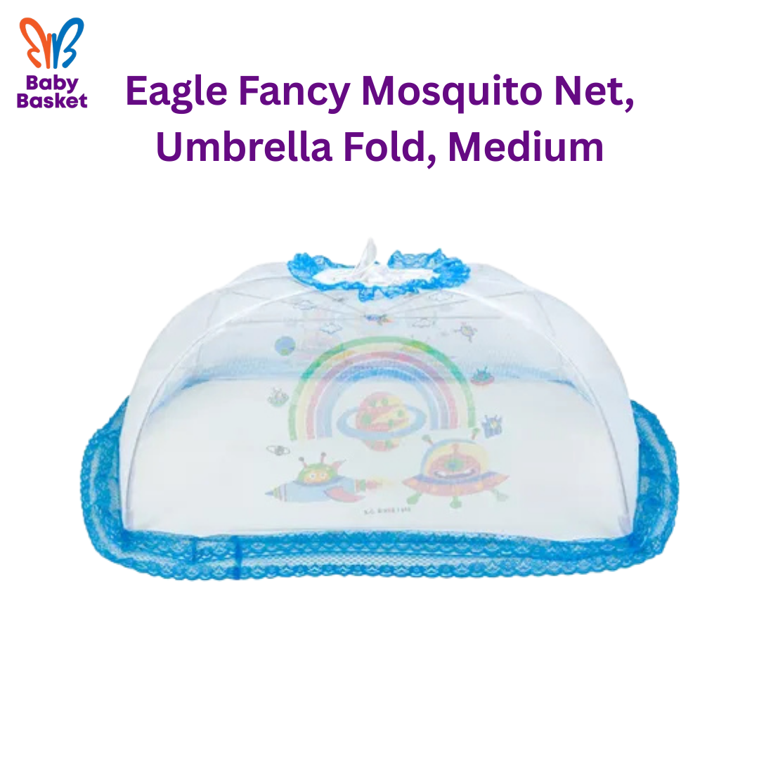 The Eagle Fancy Mosquito Net, Umbrella Fold (Medium) is a medium-size, pop-open umbrella-style mosquito protection net designed to keep babies and toddlers safe from mosquitoes, flies, and other small insects while they sleep, nap, or play. Its simple umbrella-type fold makes setup and storage quick and convenient — ideal for everyday use at home or when traveling.